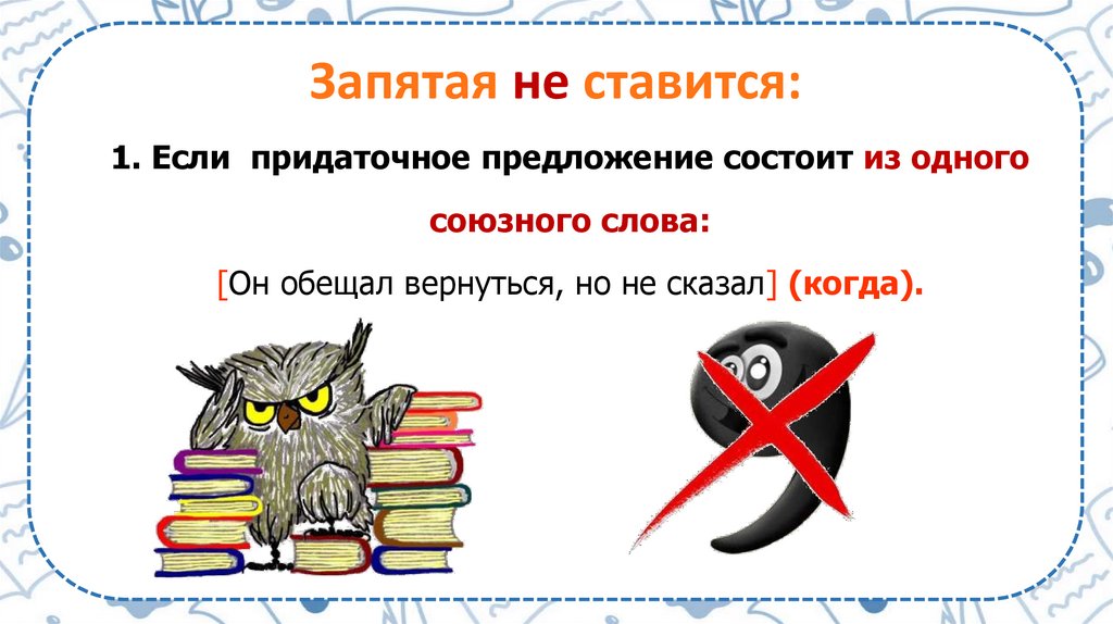 Запятая не ставится:1. Если придаточное предложение состоит из одного