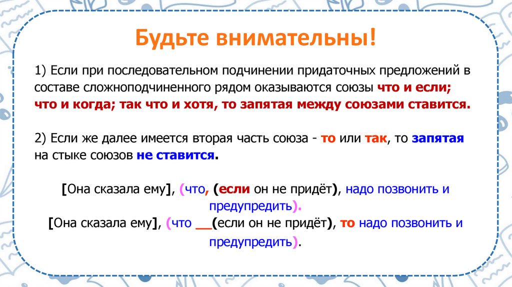 Будьте внимательны!1) Если при последовательном подчинении придаточных предложений в