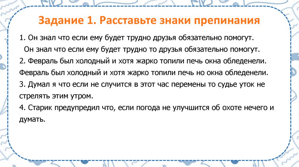 Задание 1. Расставьте знаки препинания1. Он знал что если ему будет трудно друзья обязательно помогут.