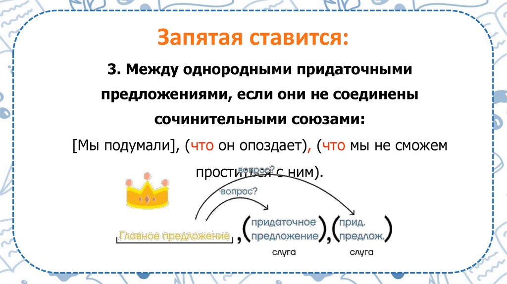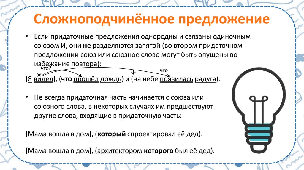 Сложноподчинённое предложение• Если придаточные предложения однородны и связаны одиночным