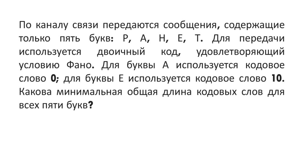 По каналу связи передаются сообщения, содержащиетолько пять букв: Р, А, Н, Е, Т. Для передачи