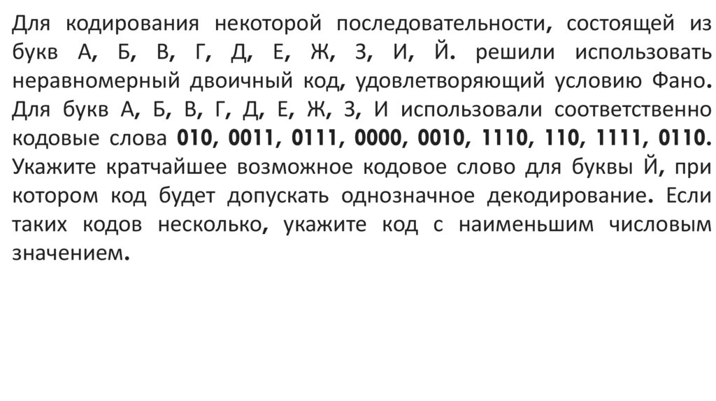Для кодирования некоторой последовательности, состоящей избукв А, Б, В, Г, Д, Е, Ж, З, И, Й. решили использовать