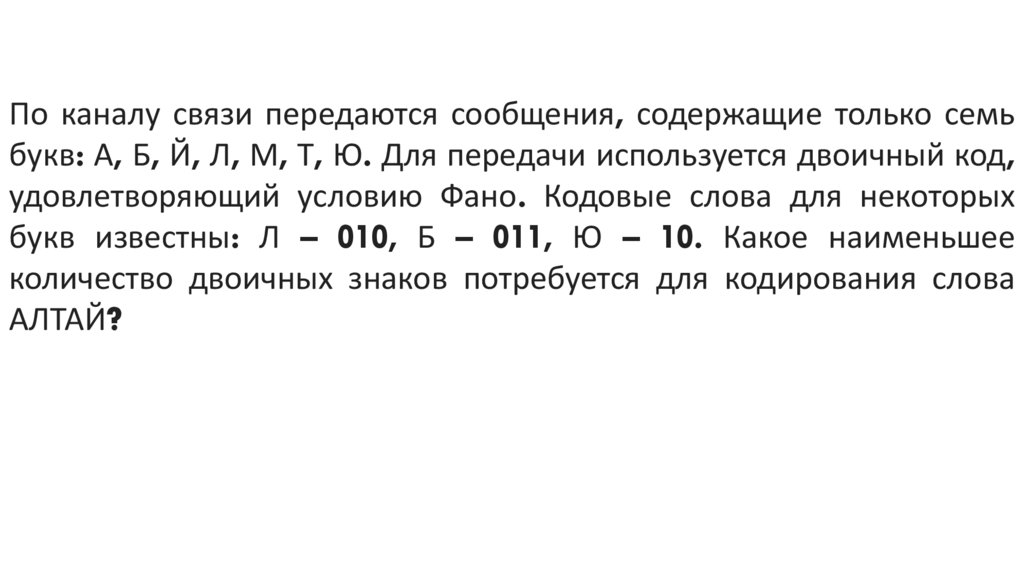 По каналу связи передаются сообщения, содержащие только семьбукв: А, Б, Й, Л, М, Т, Ю. Для передачи используется двоичный код,