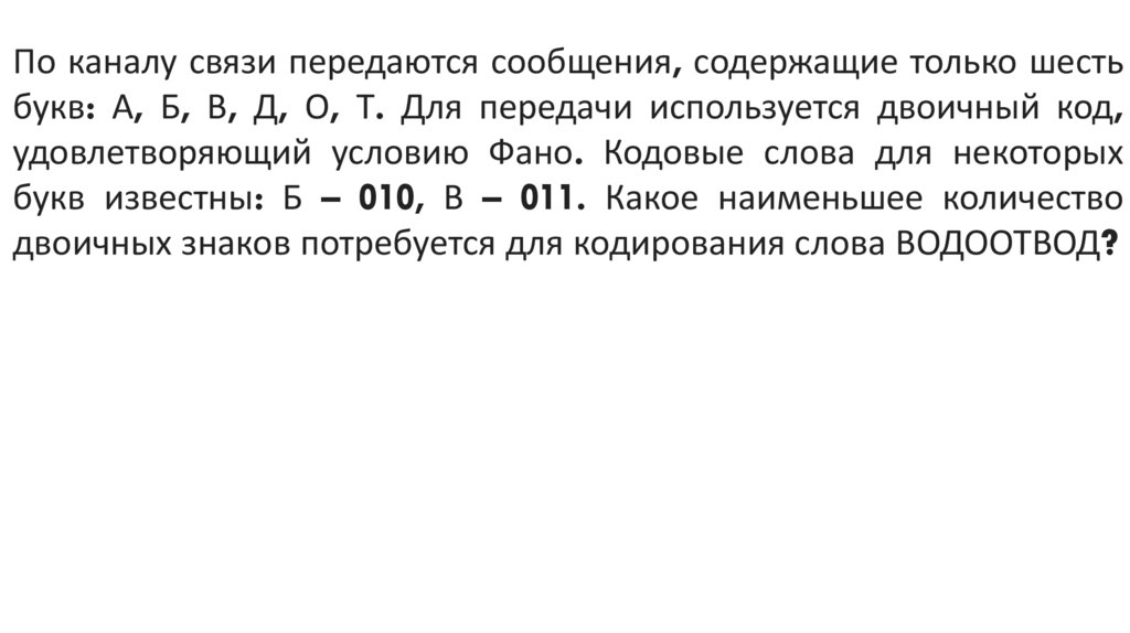 По каналу связи передаются сообщения, содержащие только шестьбукв: А, Б, В, Д, О, Т. Для передачи используется двоичный код,