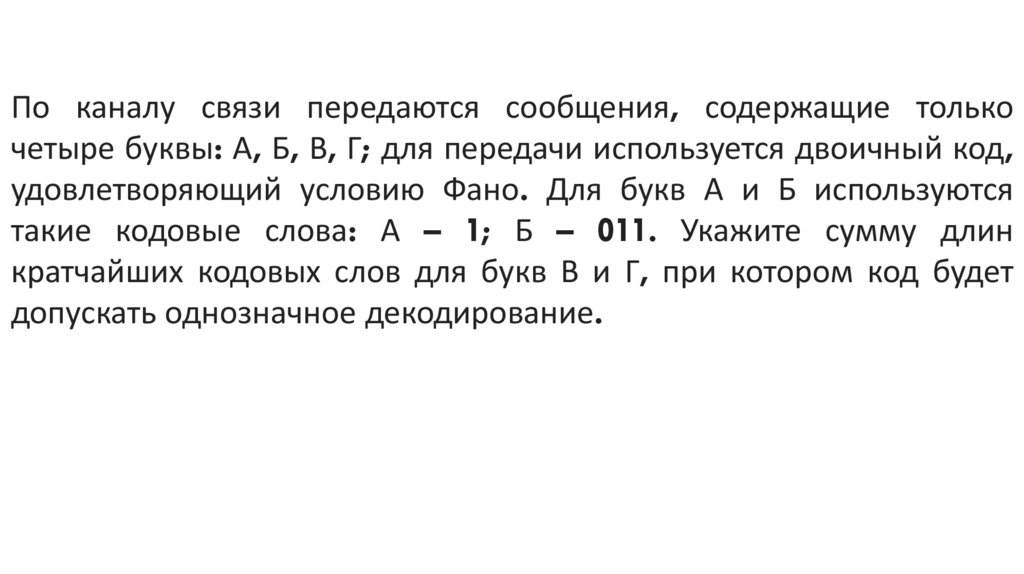 По каналу связи передаются сообщения, содержащие толькочетыре буквы: А, Б, В, Г; для передачи используется двоичный код,