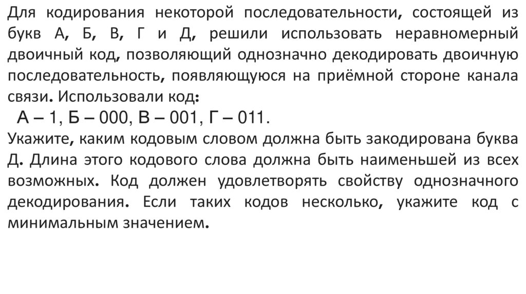 Для кодирования некоторой последовательности, состоящей избукв А, Б, В, Г и Д, решили использовать неравномерный