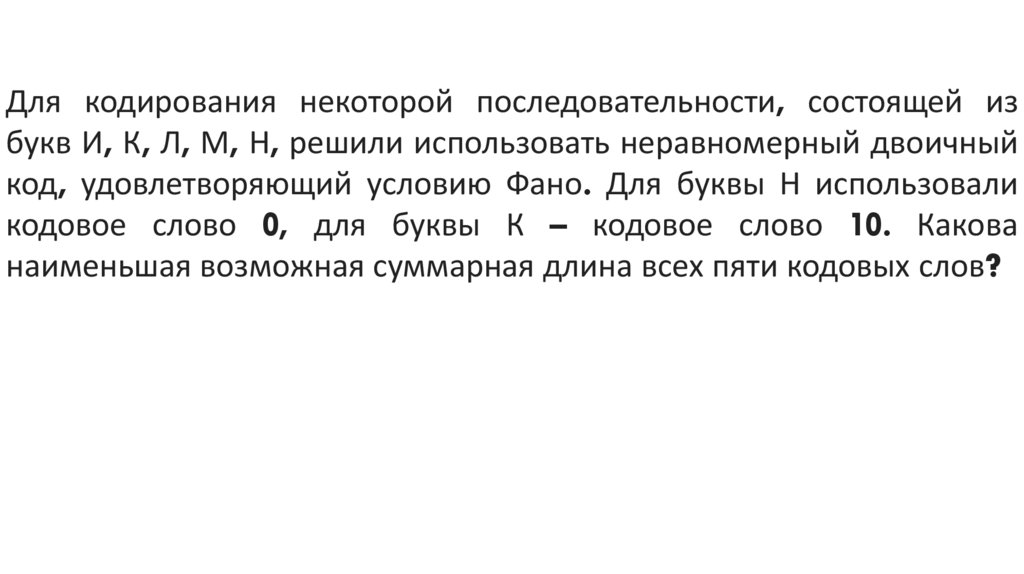 Для кодирования некоторой последовательности, состоящей избукв И, К, Л, М, Н, решили использовать неравномерный двоичный