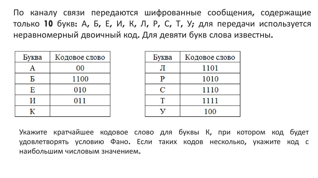 По каналу связи передаются шифрованные сообщения, содержащиетолько 10 букв: А, Б, Е, И, К, Л, Р, С, Т, У; для передачи используется