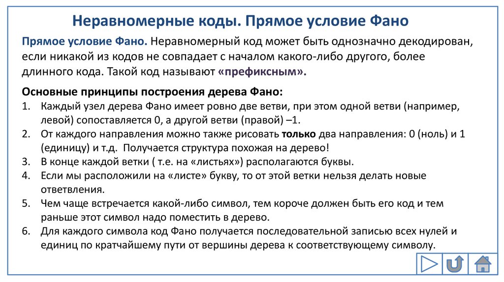 Неравномерные коды. Прямое условие ФаноПрямое условие Фано. Неравномерный код может быть однозначно декодирован,