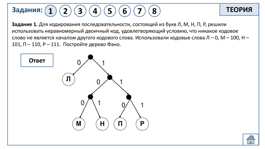 Задание 1. Для кодирования последовательности, состоящей из букв Л, М, Н, П, Р, решили