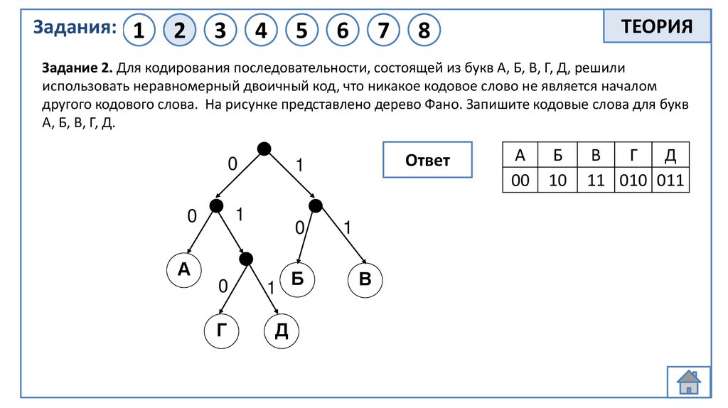 Задание 2. Для кодирования последовательности, состоящей из букв А, Б, В, Г, Д, решили