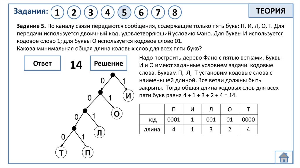 Задание 5. По каналу связи передаются сообщения, содержащие только пять букв: П, И, Л, О, Т. Для