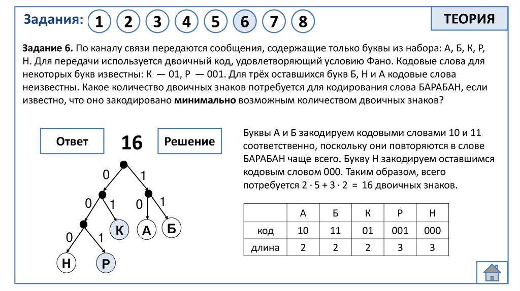 Задание 6. По каналу связи передаются сообщения, содержащие только буквы из набора: А, Б, К, Р,