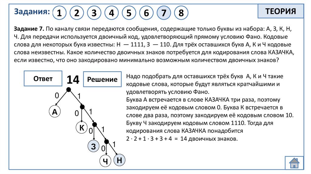 Задание 7. По каналу связи передаются сообщения, содержащие только буквы из набора: А, З, К, Н,