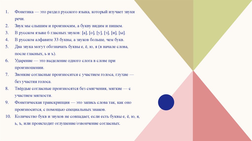 1.Фонетика — это раздел русского языка, который изучает звуки