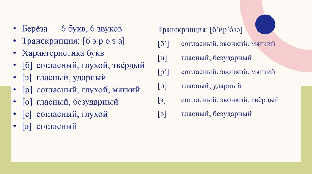 • Берёза — 6 букв, 6 звуков• Транскрипция: [б э р о з а]