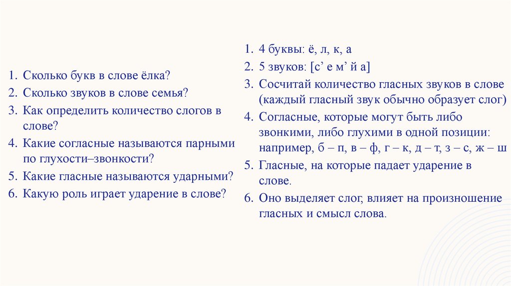 6. Какую роль играет ударение в слове? 6. Оно выделяет слог, влияет на произношение