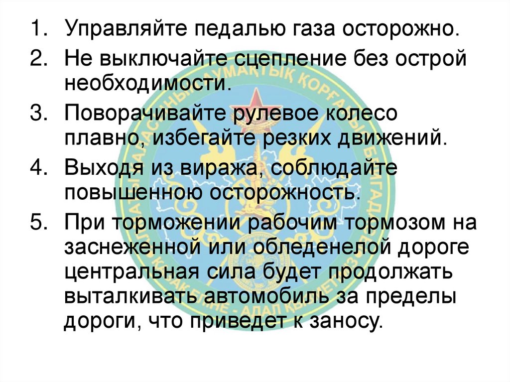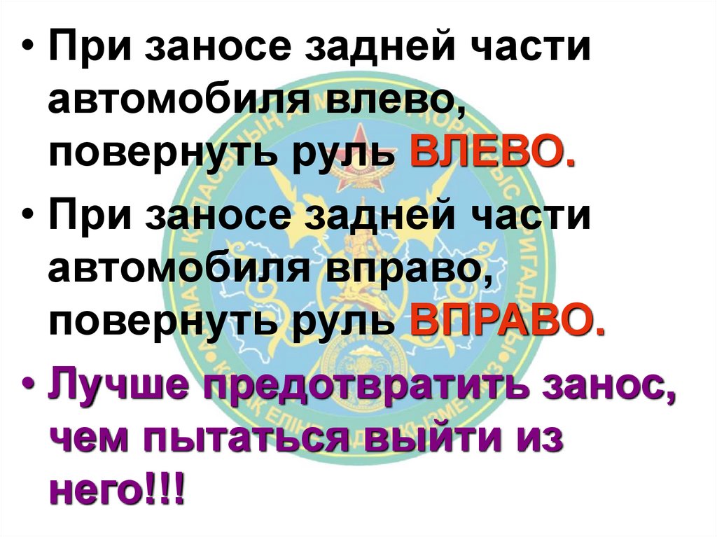 • Лучше предотвратить занос,