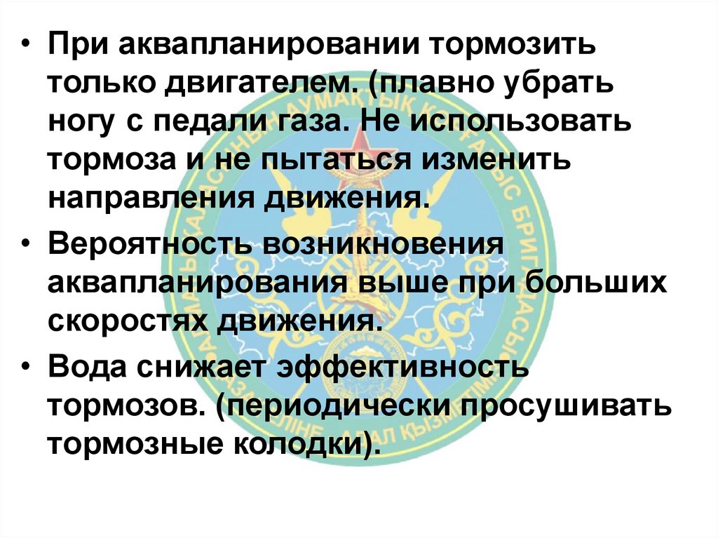 • При аквапланировании тормозитьтолько двигателем. (плавно убрать