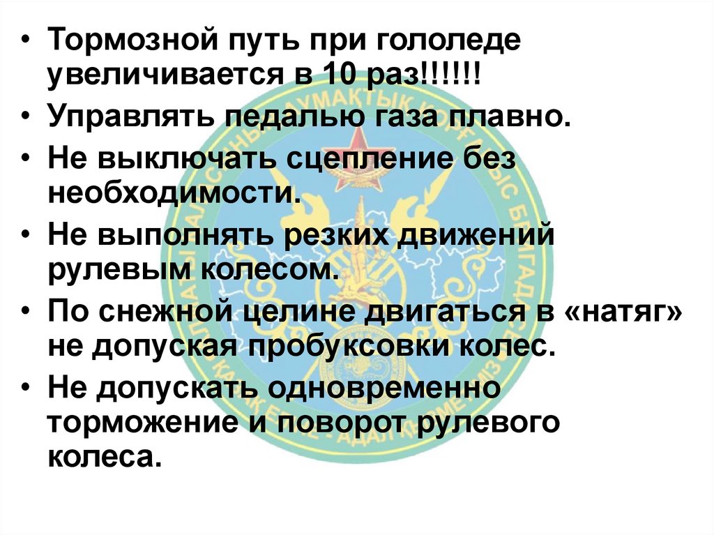 • Тормозной путь при гололедеувеличивается в 10 раз!!!!!!
