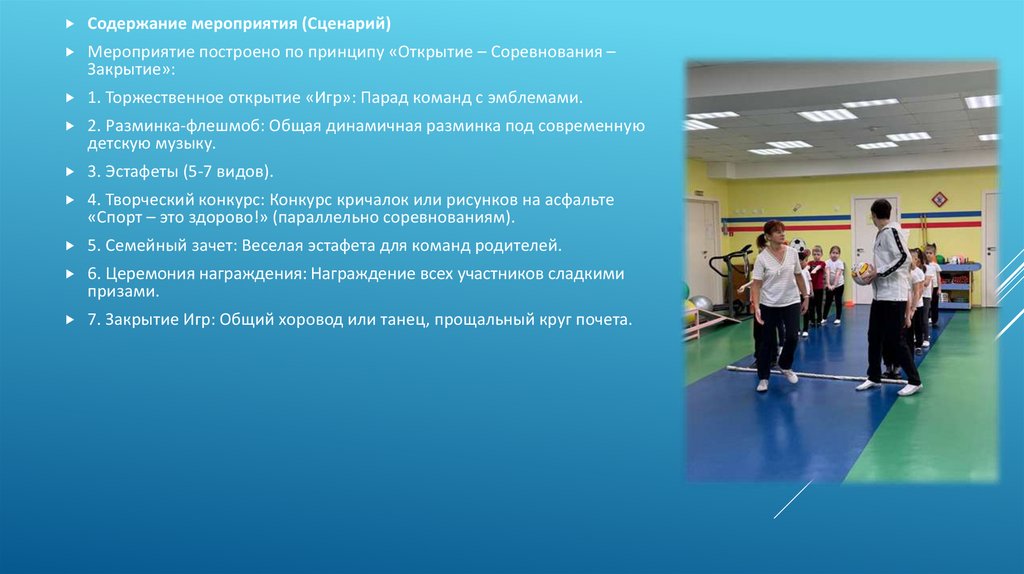 Содержание мероприятия (Сценарий)Мероприятие построено по принципу «Открытие – Соревнования –