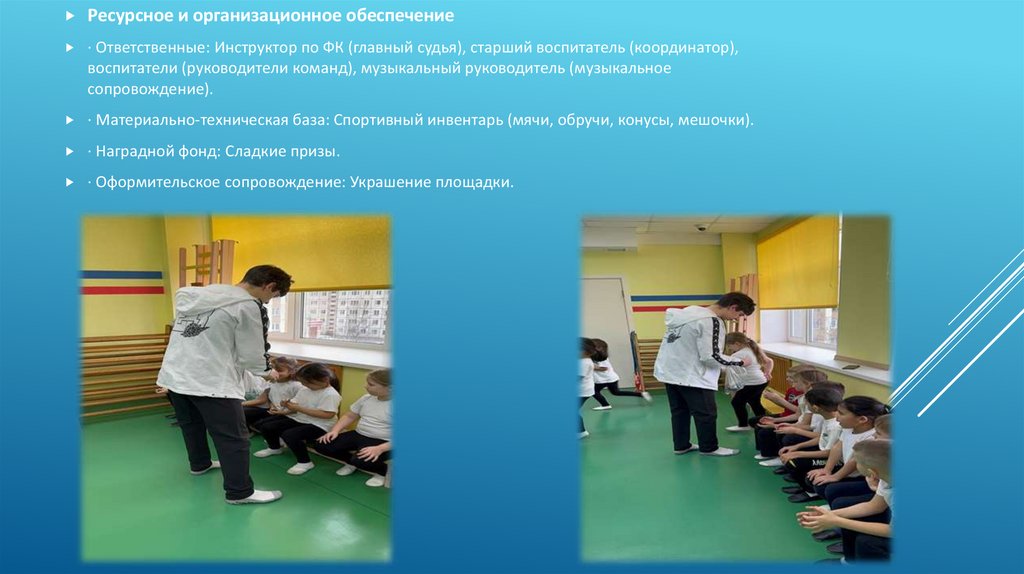 Ресурсное и организационное обеспечение· Ответственные: Инструктор по ФК (главный судья), старший воспитатель (координатор),