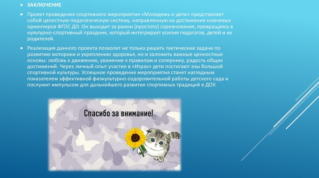 ЗАКЛЮЧЕНИЕПроект проведения спортивного мероприятия «Молодежь и дети» представляет