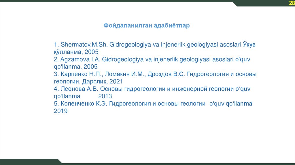 2. Agzamova I.A. Gidrogeologiya va injenerlik geologiyasi asoslari o‘quv