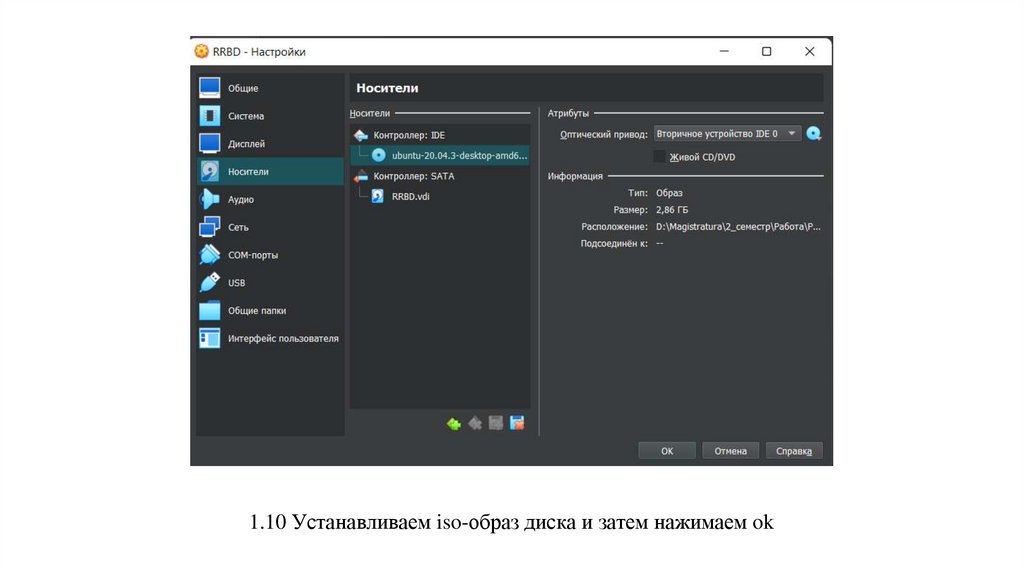1.10 Устанавливаем iso-образ диска и затем нажимаем ok