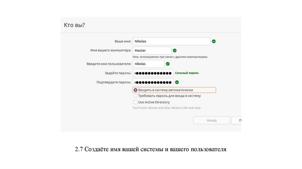 2.7 Создаёте имя вашей системы и вашего пользователя
