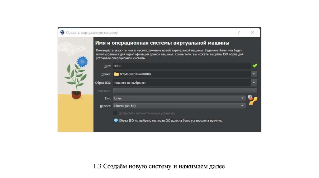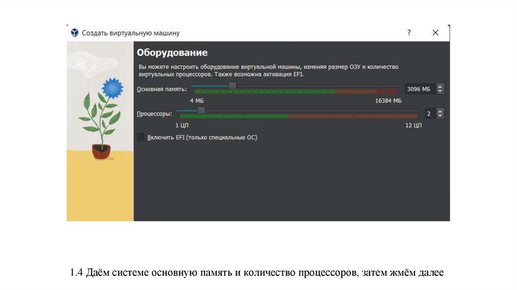 1.4 Даём системе основную память и количество процессоров, затем жмём далее
