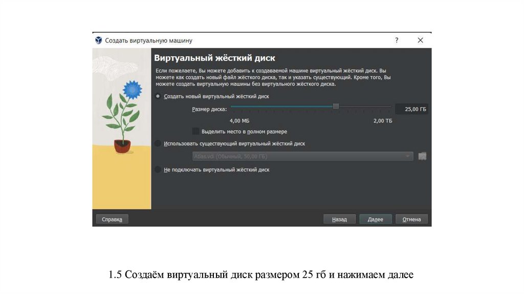 1.5 Создаём виртуальный диск размером 25 гб и нажимаем далее