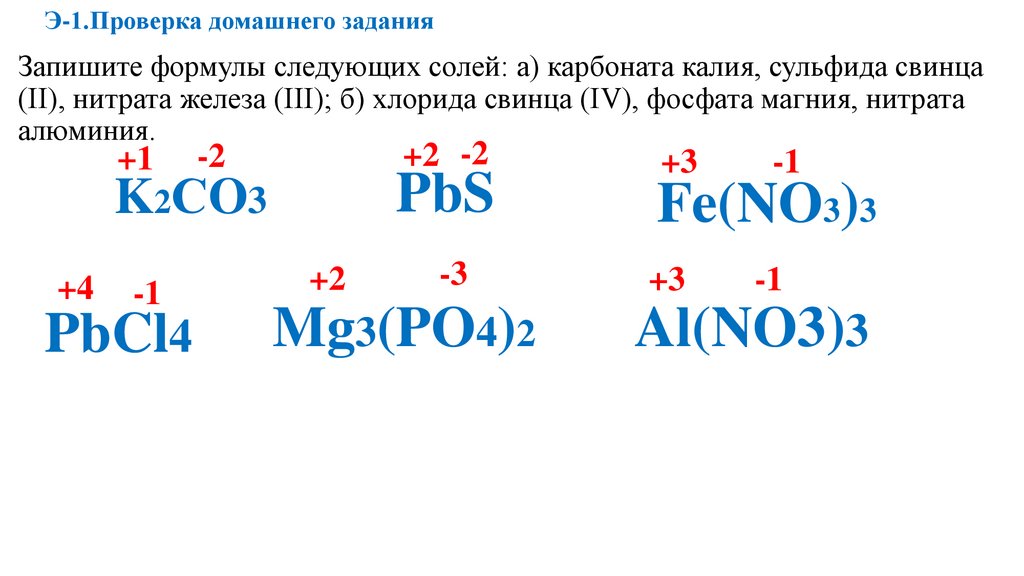 Э-1.Проверка домашнего заданияЗапишите формулы следующих солей: а) карбоната калия, сульфида свинца
