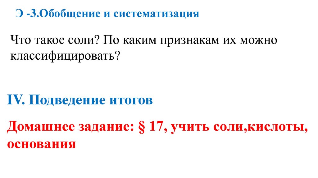 Э -3.Обобщение и систематизацияЧто такое соли? По каким признакам их можно