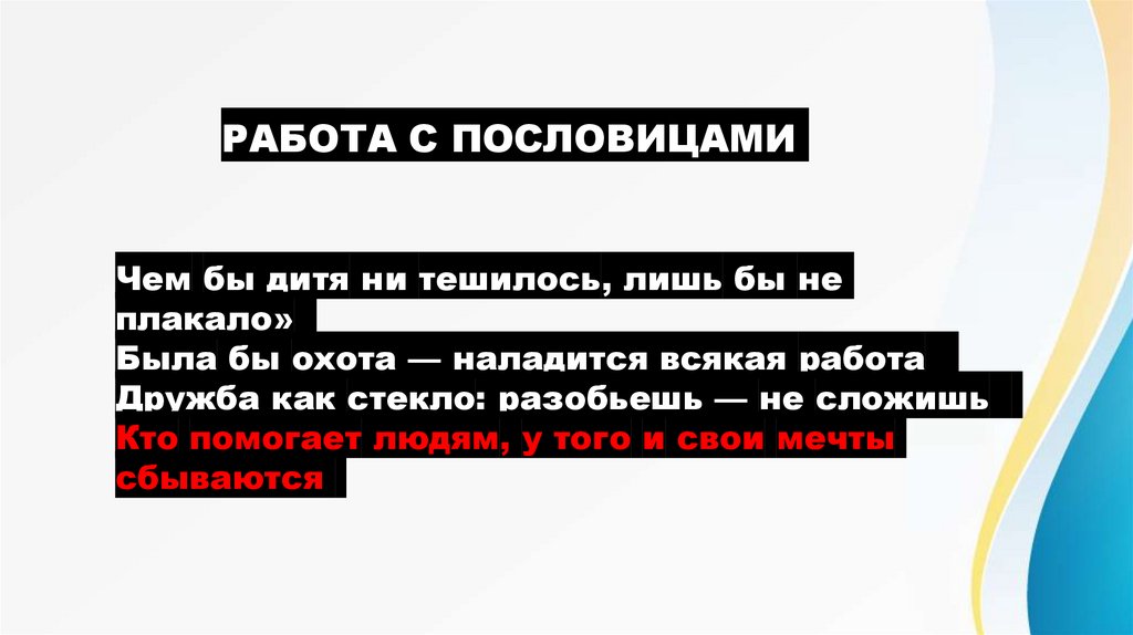 РАБОТА С ПОСЛОВИЦАМИЧем бы дитя ни тешилось, лишь бы не