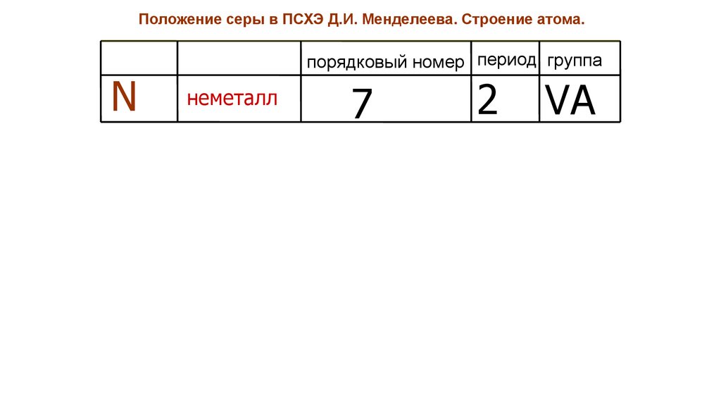 Положение серы в ПСХЭ Д.И. Менделеева. Строение атома.N