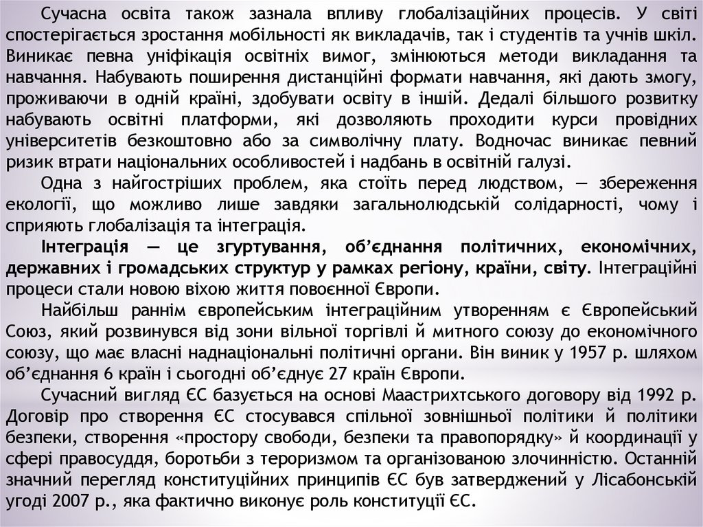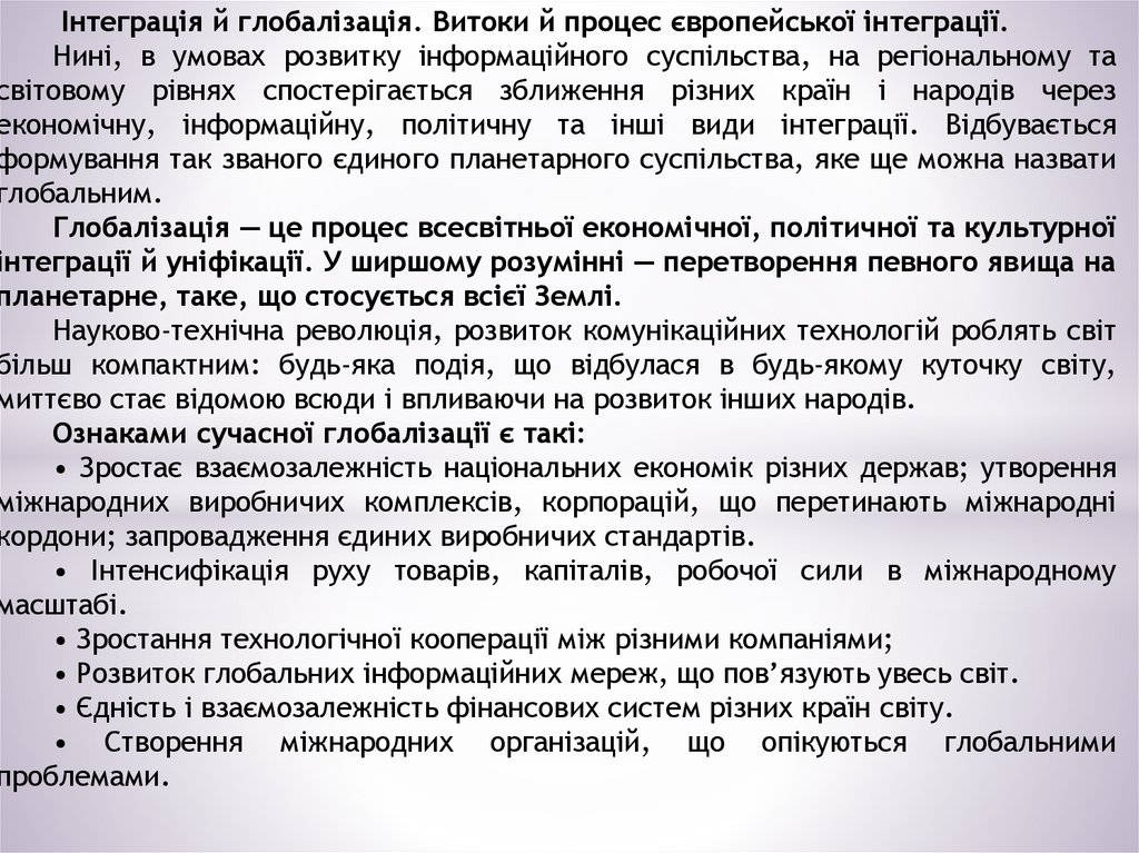 Інтеграція й глобалізація. Витоки й процес європейської інтеграції.Нині, в умовах розвитку інформаційного суспільства, на регіональному та