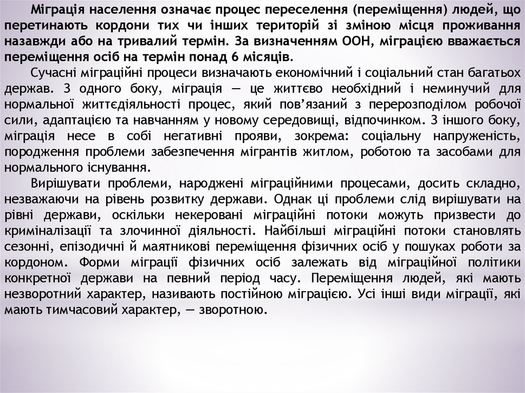 Міграція населення означає процес переселення (переміщення) людей, щоперетинають кордони тих чи інших територій зі зміною місця проживання