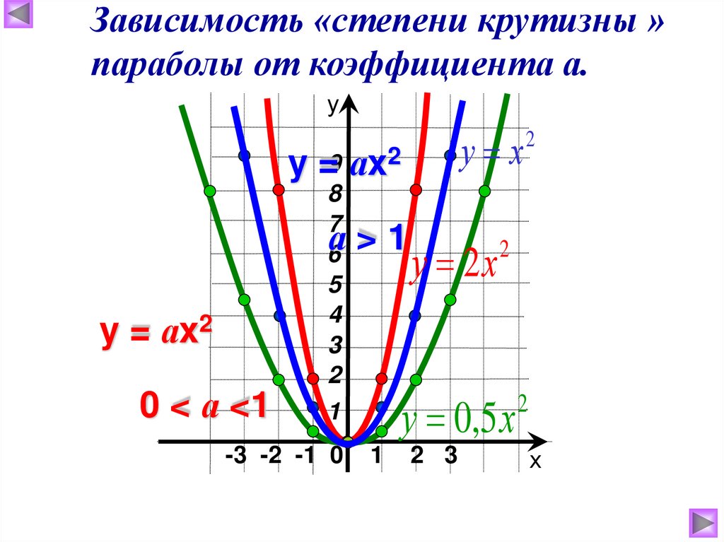 Зависимость «степени крутизны »параболы от коэффициента а.
