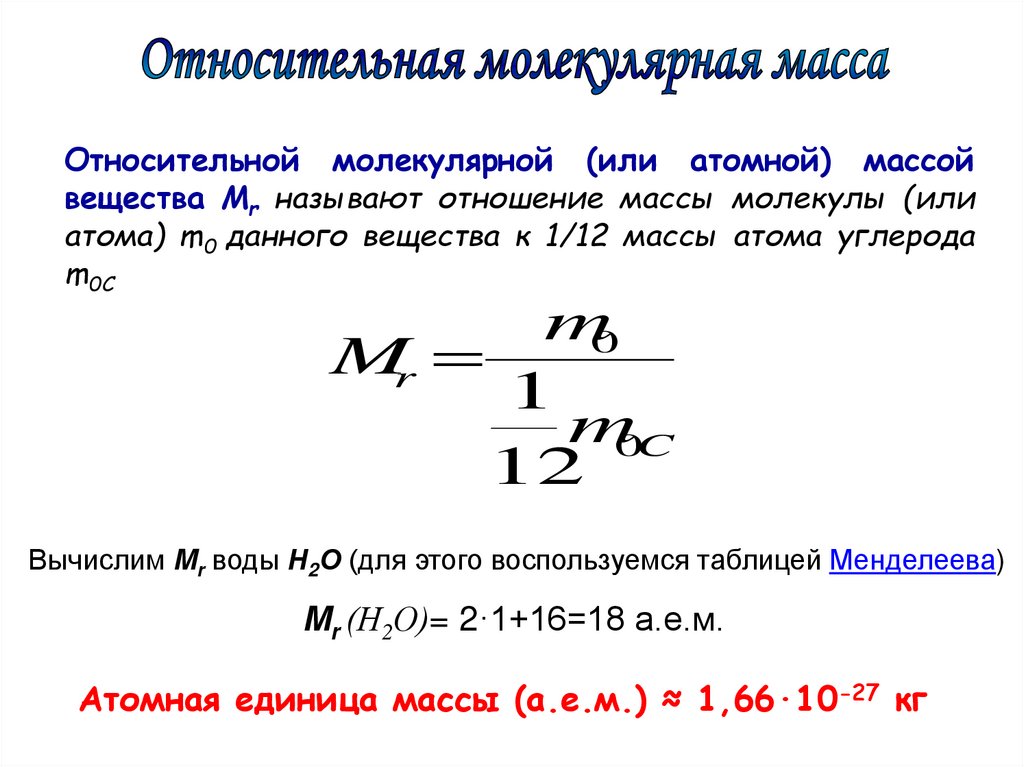 Относительной молекулярной (или атомной) массойвещества Мr называют отношение массы молекулы (или