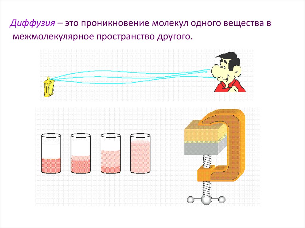 Диффузия – это проникновение молекул одного вещества вмежмолекулярное пространство другого.