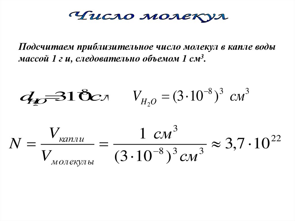 Подсчитаем приблизительное число молекул в капле водымассой 1 г и, следовательно объемом 1 см3.