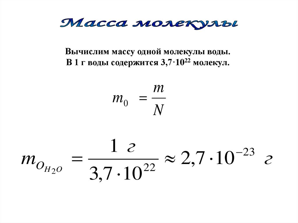 Вычислим массу одной молекулы воды.В 1 г воды содержится 3,7·1022 молекул.