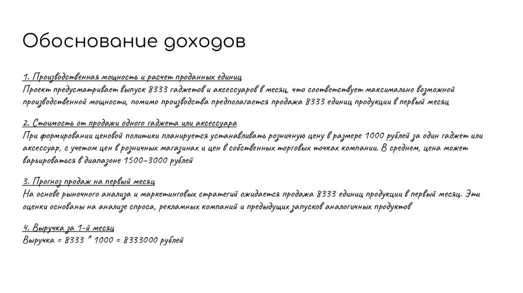 Рост продаж за счет масштабирования: После запуска проекта и закрепления на рынке ожидается постепенное увеличение объема продаж за счет расширения каналов сбыта и увеличения