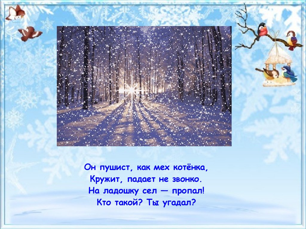 Он пушист, как мех котёнка,Кружит, падает не звонко.