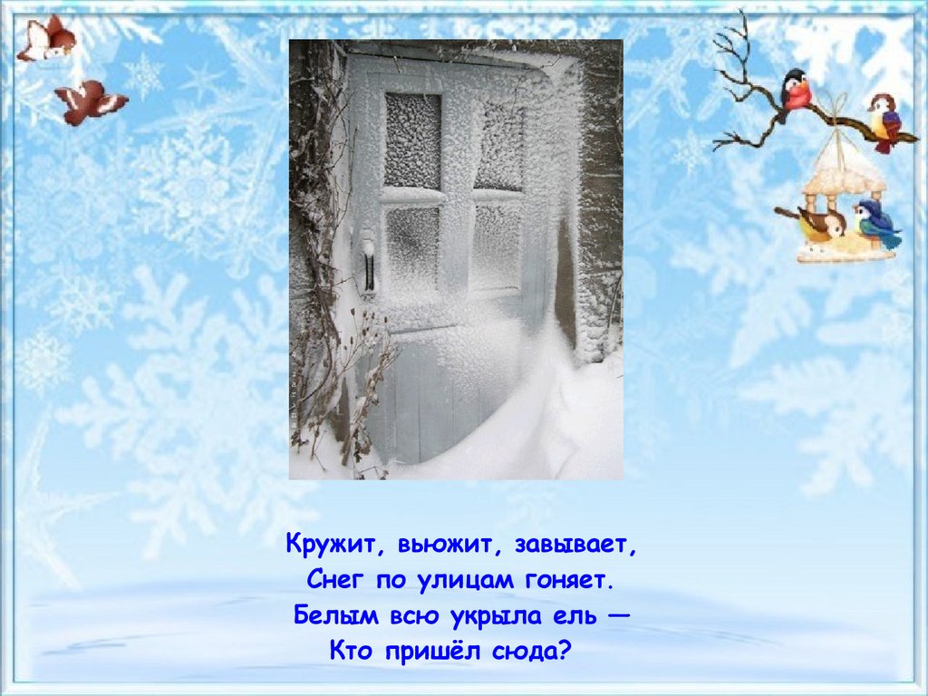 Кружит, вьюжит, завывает,Снег по улицам гоняет.