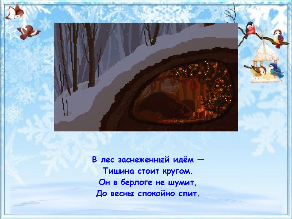 В лес заснеженный идём —Тишина стоит кругом.