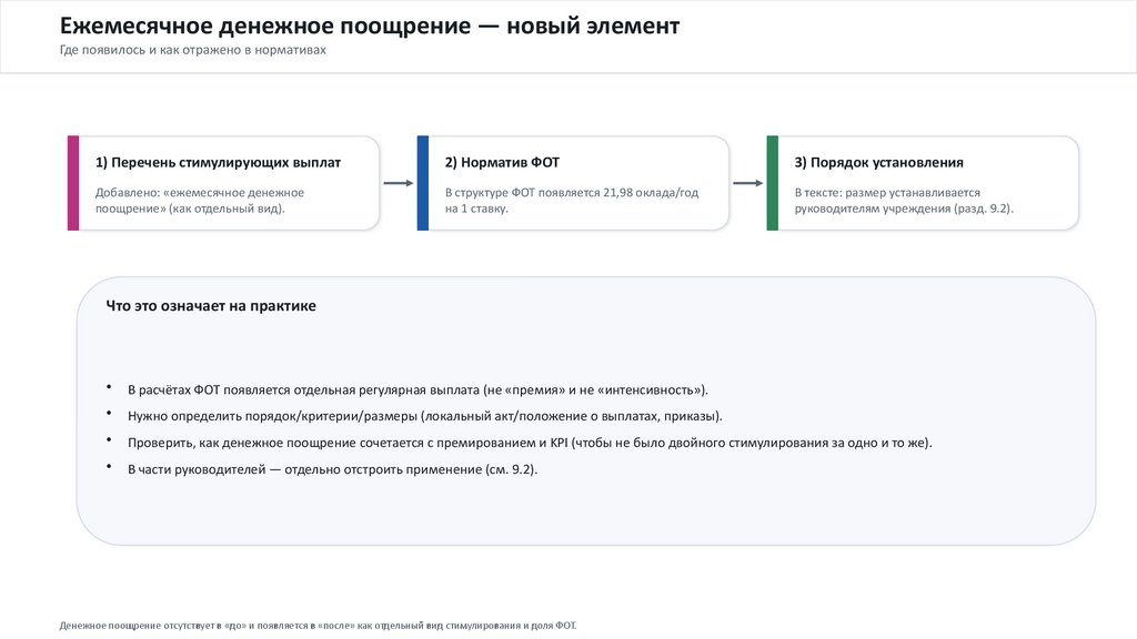 Денежное поощрение отсутствует в «до» и появляется в «после» как отдельный вид стимулирования и доля ФОТ.