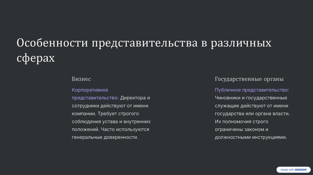 • Бизнес: Руководители компаний действуют от имени юридического лица, заключая сделки.
