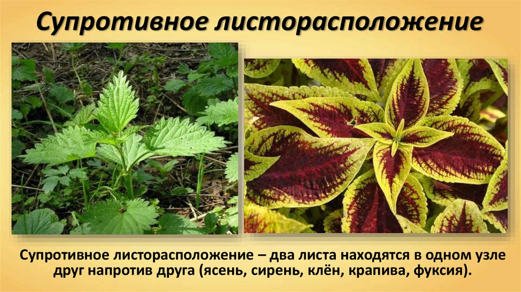 друг напротив друга (ясень, сирень, клён, крапива, фуксия).